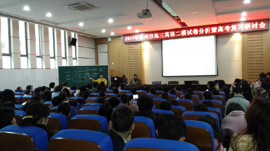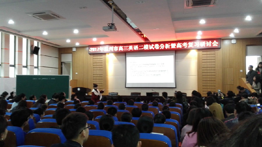 3月16日,温州八高崇德楼罗山厅里,人头攒动,盛况空前——2017年温州市高三英语高考复习研讨会暨郑秋秋名师工作室第三次研修活动在这里隆重举行。来自温州市各县市区300多名高三英语老师代表积极参加了此次活动,不仅过道坐满了与会老师,就连报考厅门口也站满了认真听课的老师。